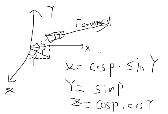 欧拉角有俯仰角(Pitch)、偏航角(Yaw)和滚转角(Roll)。对摄像机来说,设pitch是俯角,yaw是左转角(都是弧度)